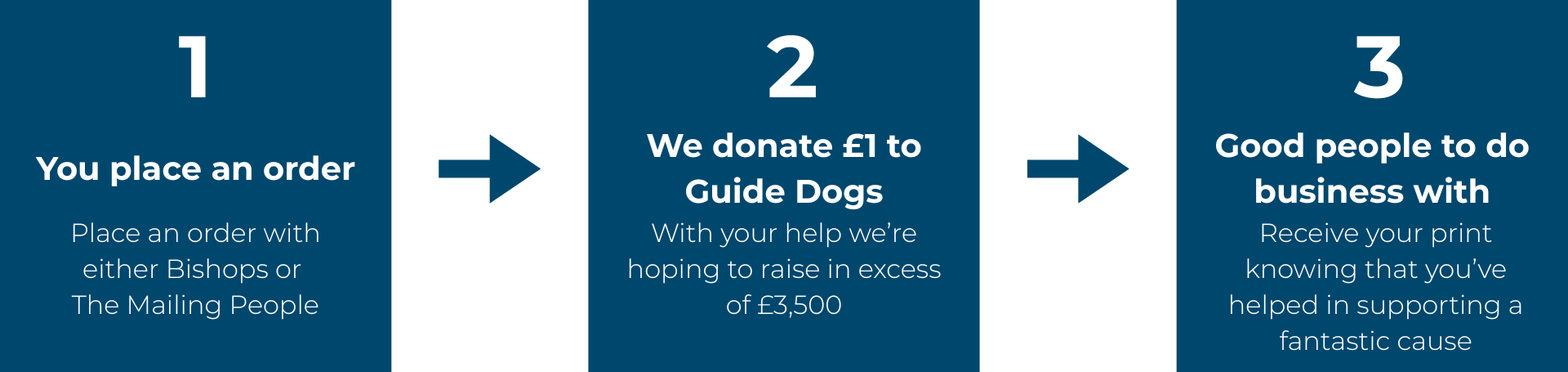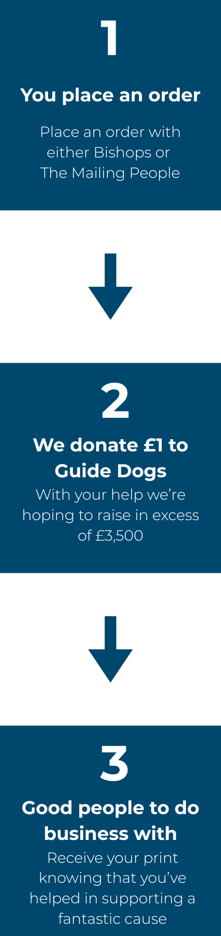 Bishops Printers will donate £1 to the Guide Dogs for the Blind Association (Registered Charity in England and Wales No. 209617, and in Scotland No. SC038979) for every order placed between 2nd January and 28th February 2026. There is no minimum or maximum total donation. The donation will be paid to the charity by 31st March 2026.